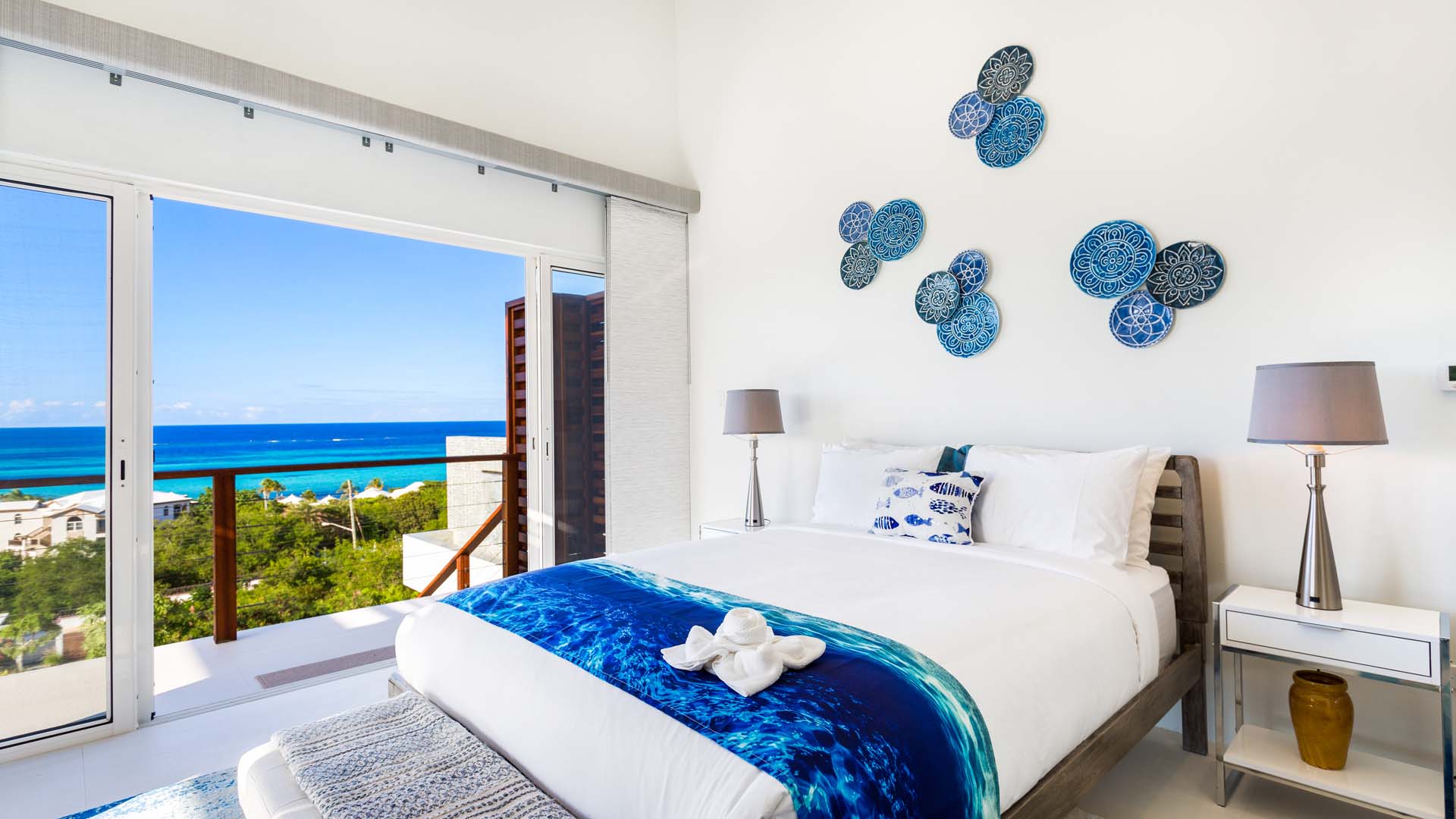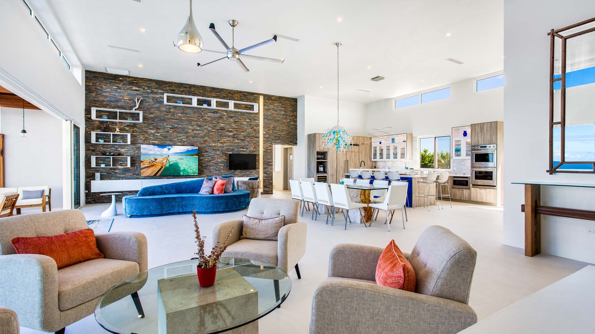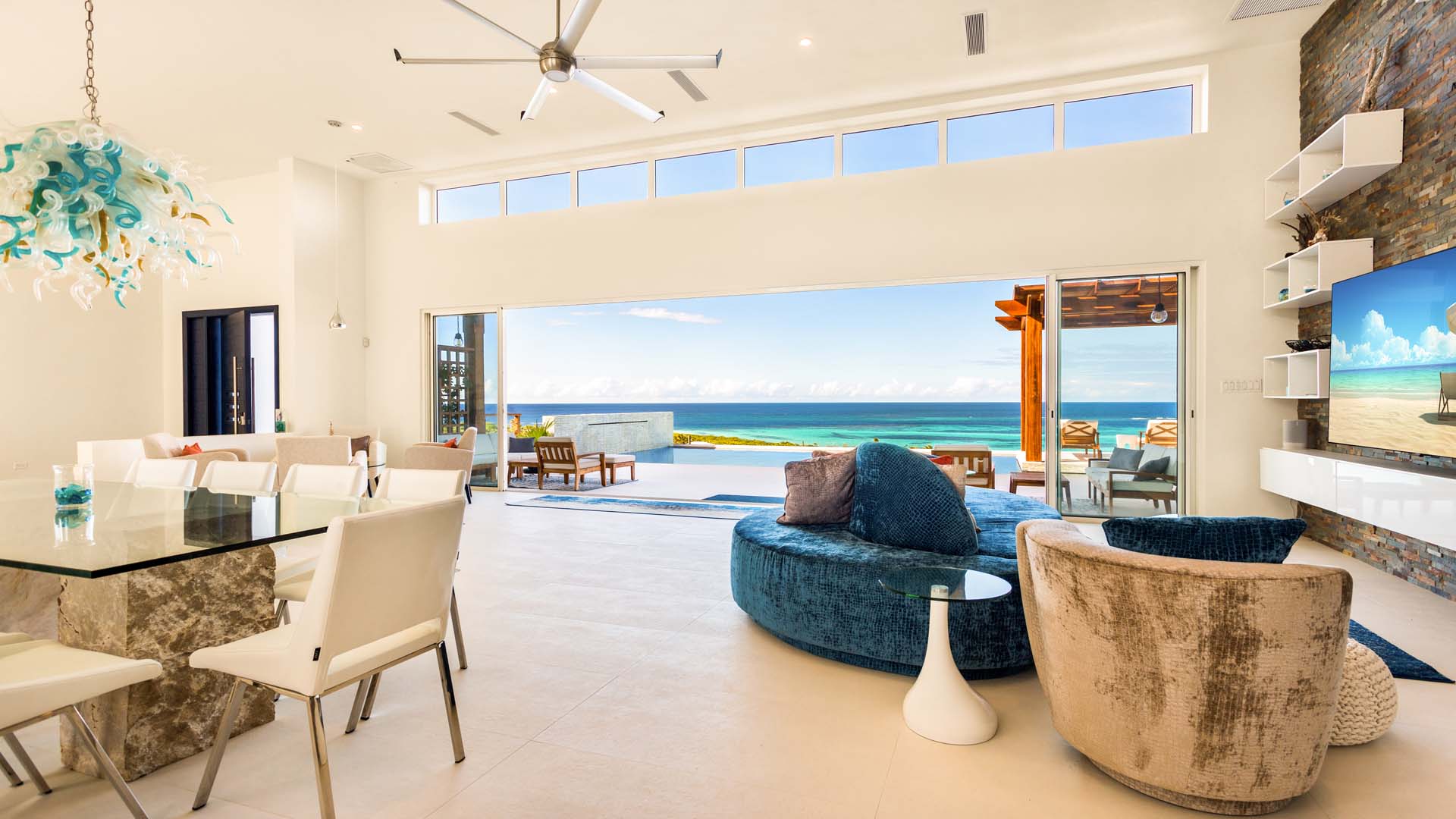 With four ocean-view bedrooms on the main level, each with its own ensuite bathroom, and a fifth ensuite bedroom located on the lower level, the villa offers comfortable accommodations for up to eight guests across its 10,000 square feet of finely curated space. The interiors are thoughtfully styled, drawing inspiration from the radiant colors and natural textures of Shoal Bay to create an atmosphere of relaxed sophistication.