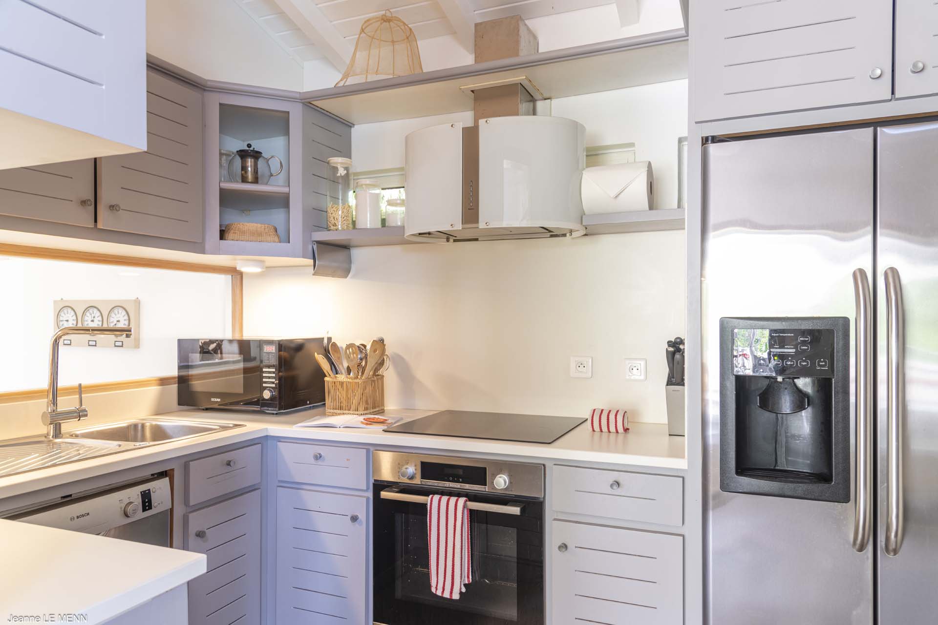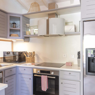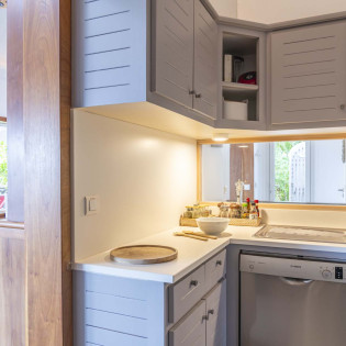 Guests love the adjacent alfresco dining area. Steps lead down from the parking area to the main level which encompasses the living room, dining area, and a well-equipped compact kitchen.