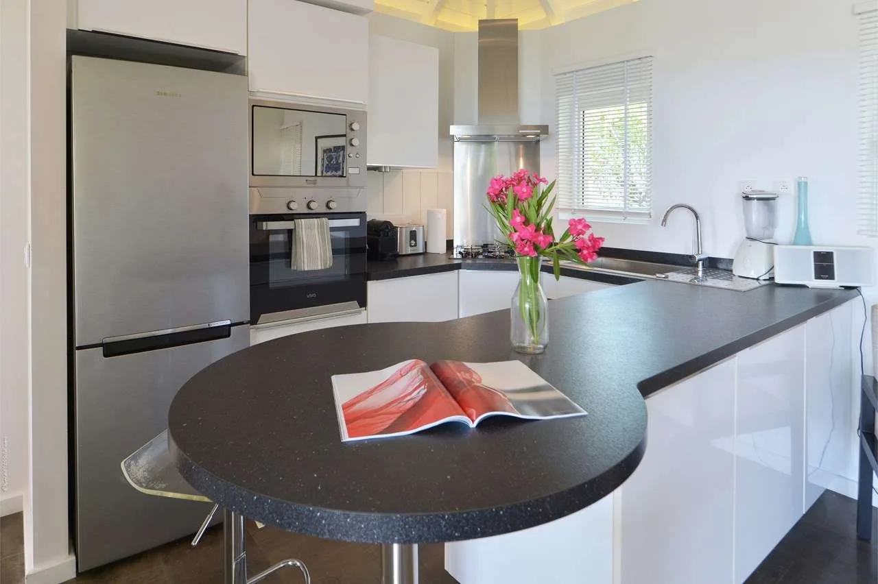 Next to the living room is Villa Alphane’s well-equipped kitchen. You’ll have everything you need to whip up gourmet island meals during your stay. Our concierge can even organize grocery pre-stocking or delivery, catered meals, or arrange private chef service for a special occasion.