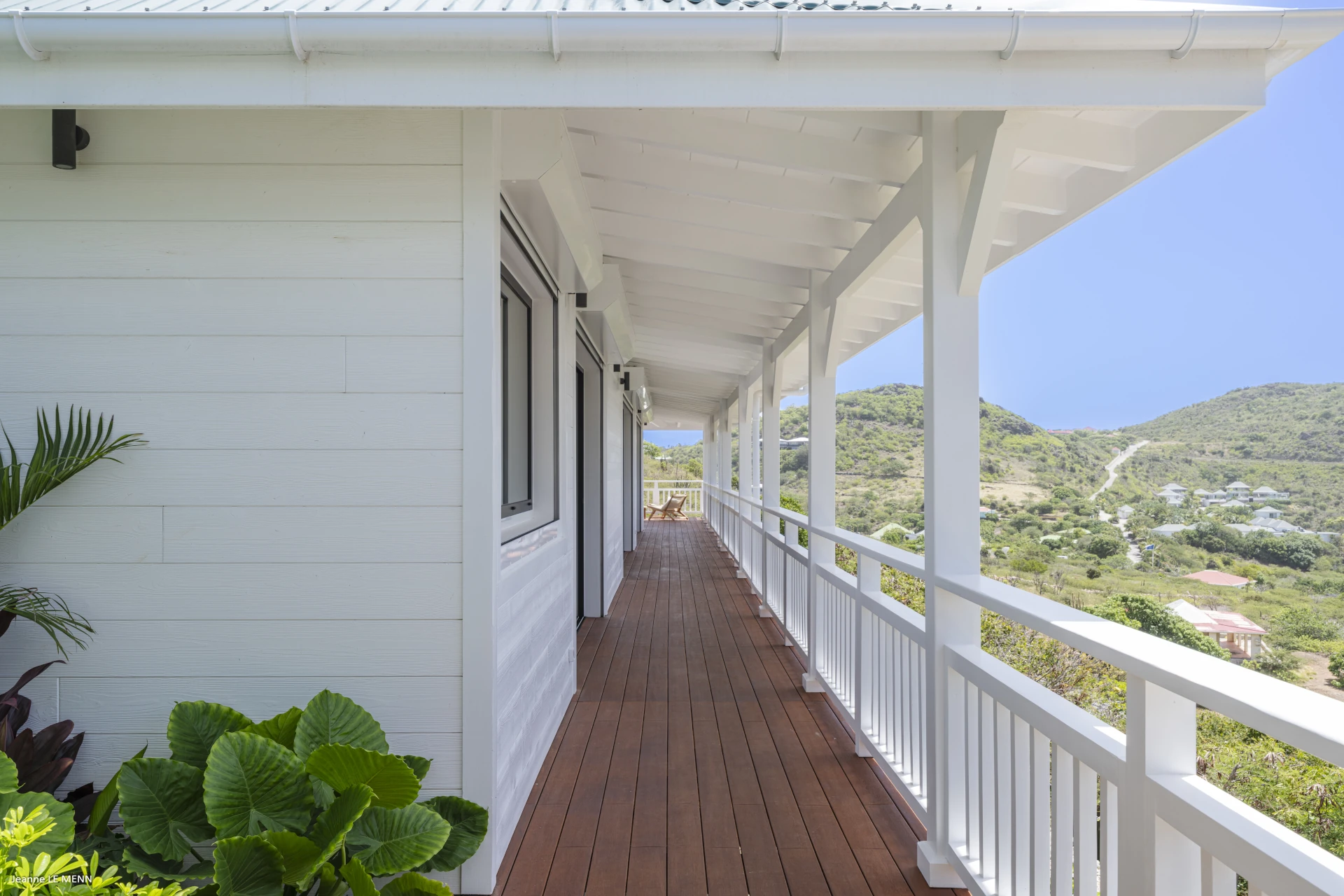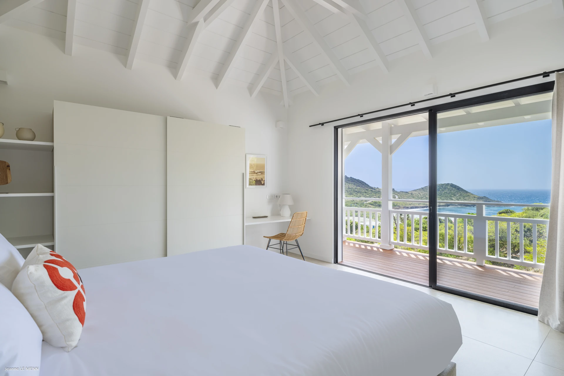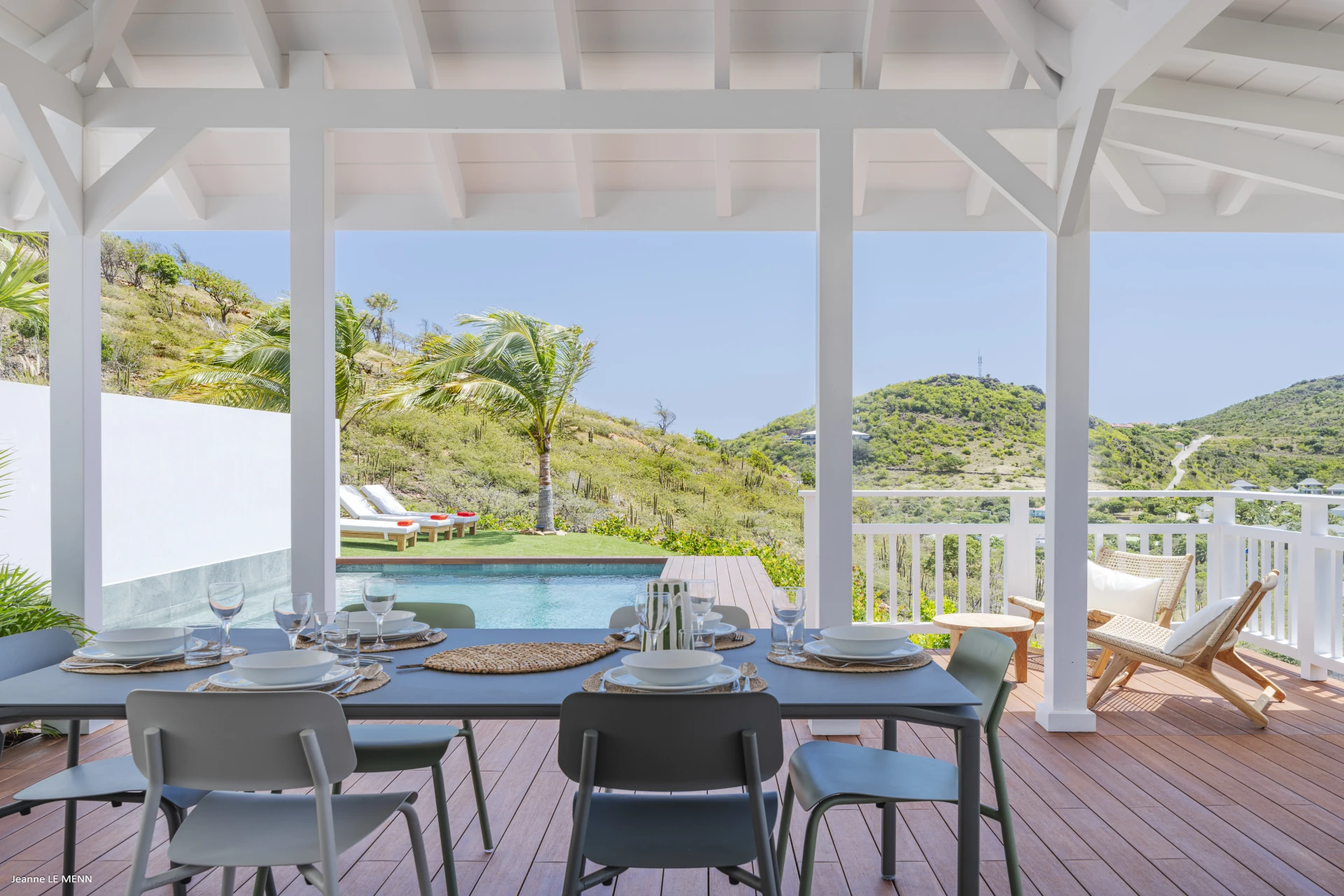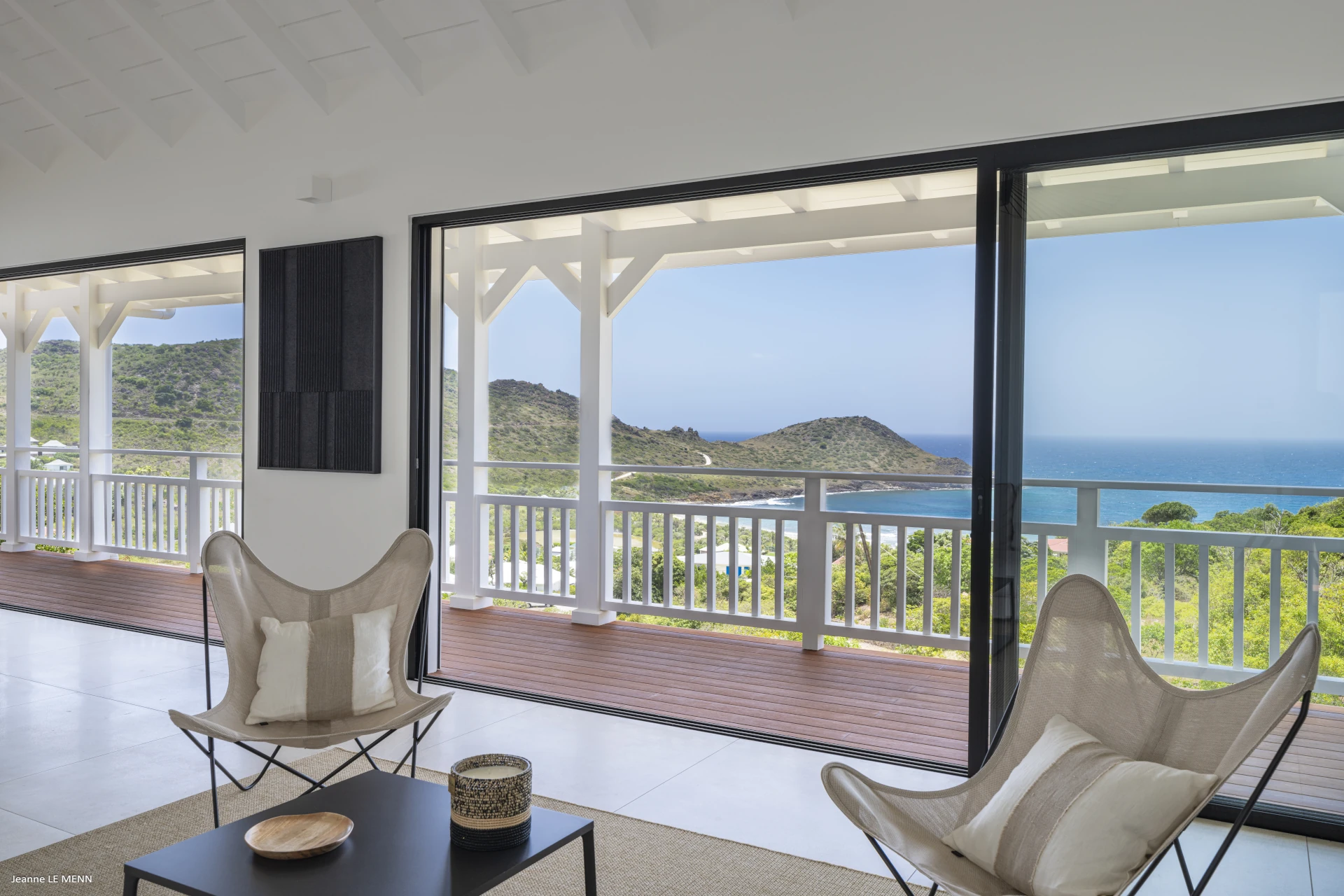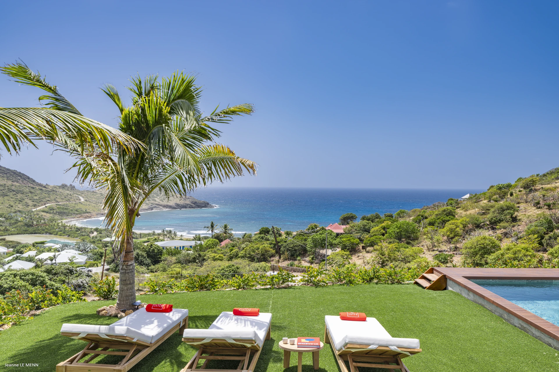 The main terrace, accessible from the living area, hosts a sparkling heated pool surrounded by verdant lawns and shaded loungers, offering mesmerizing views of the bay and St. Barts' natural beauty. A covered section houses an outdoor dining area and cozy seating, perfect for unwinding with a cocktail in the Caribbean breeze. Additionally, a long-covered terrace at the front affords an exceptional panorama of the hillside and the endless expanse of the deep-blue ocean.