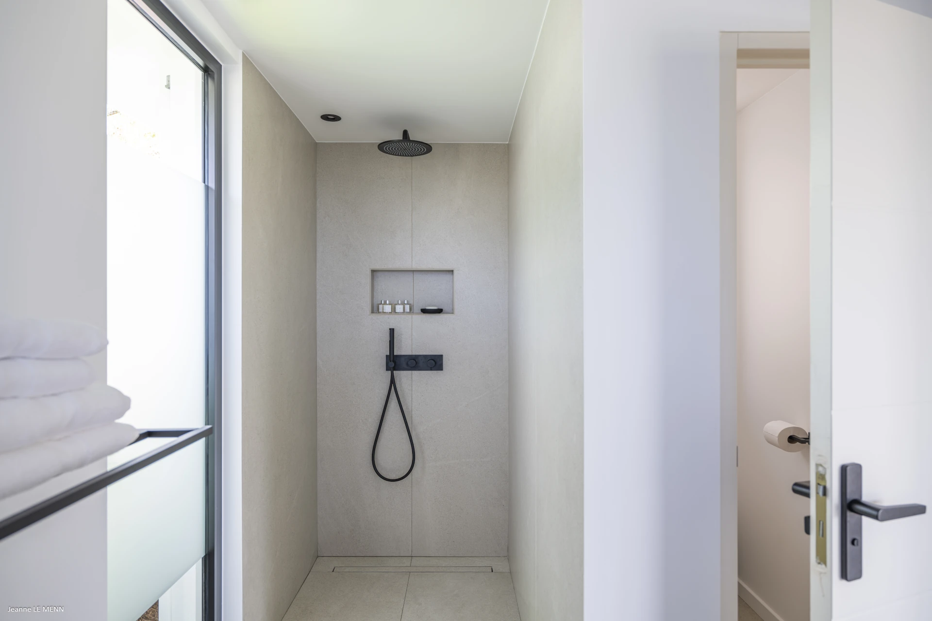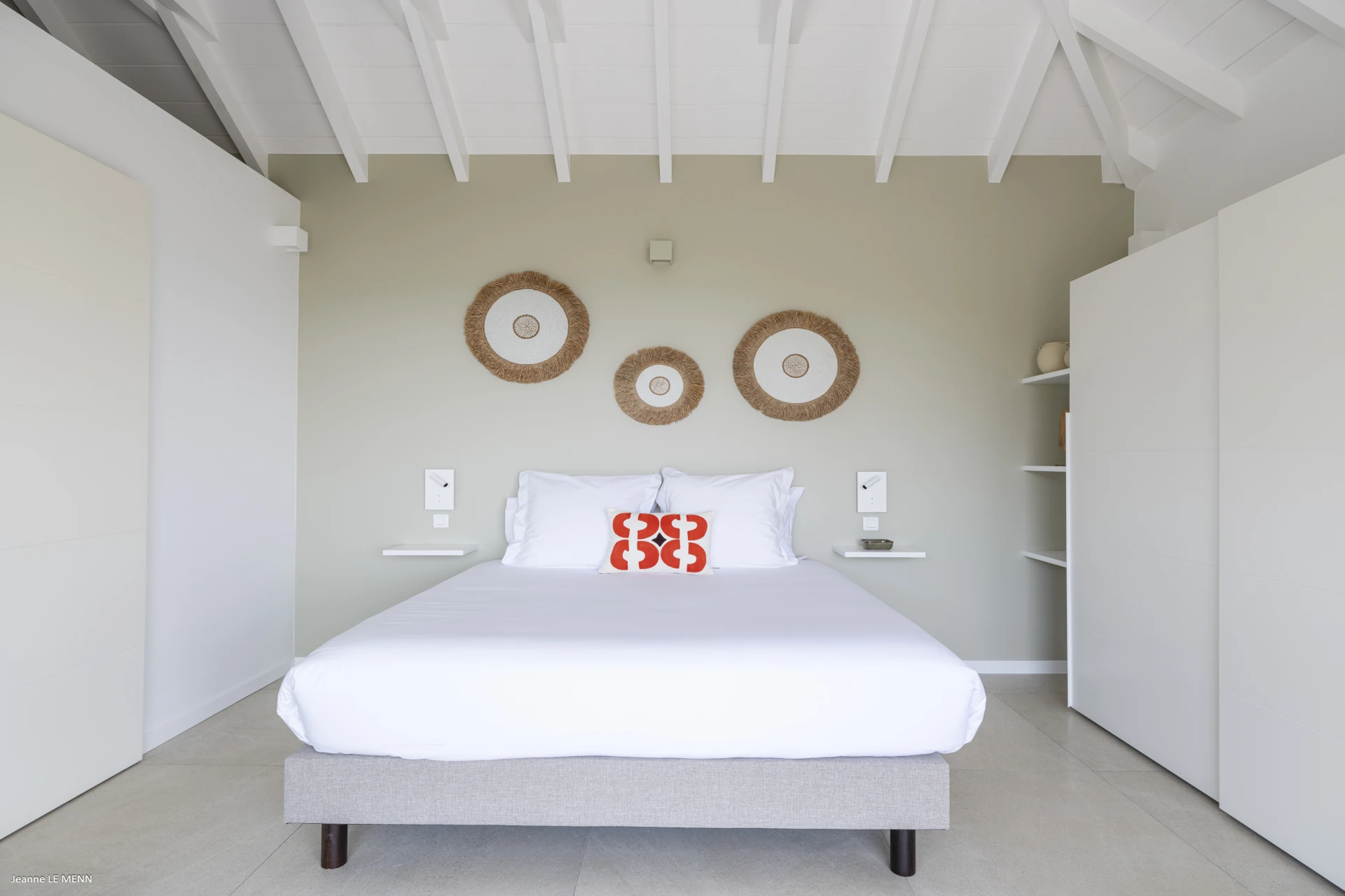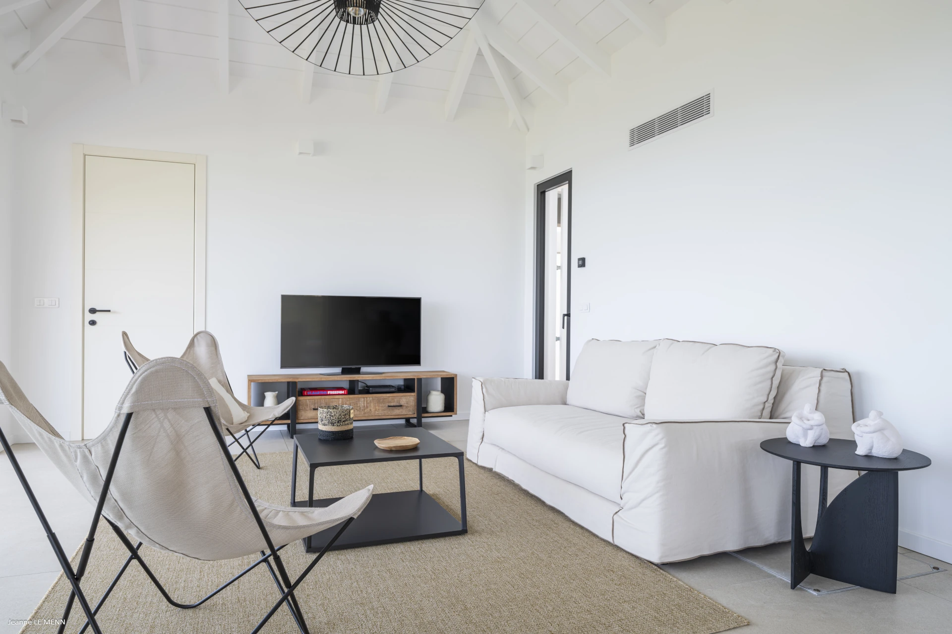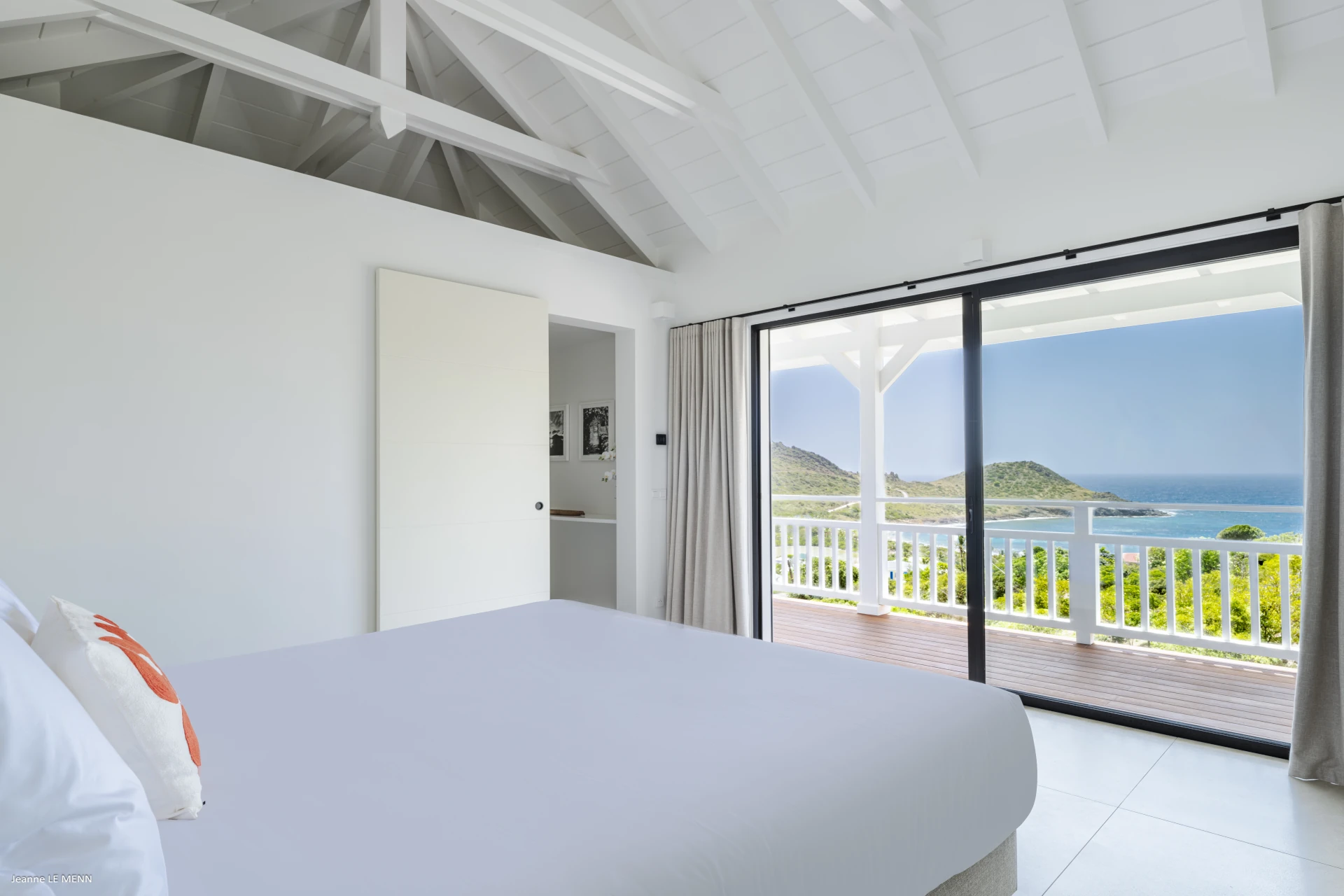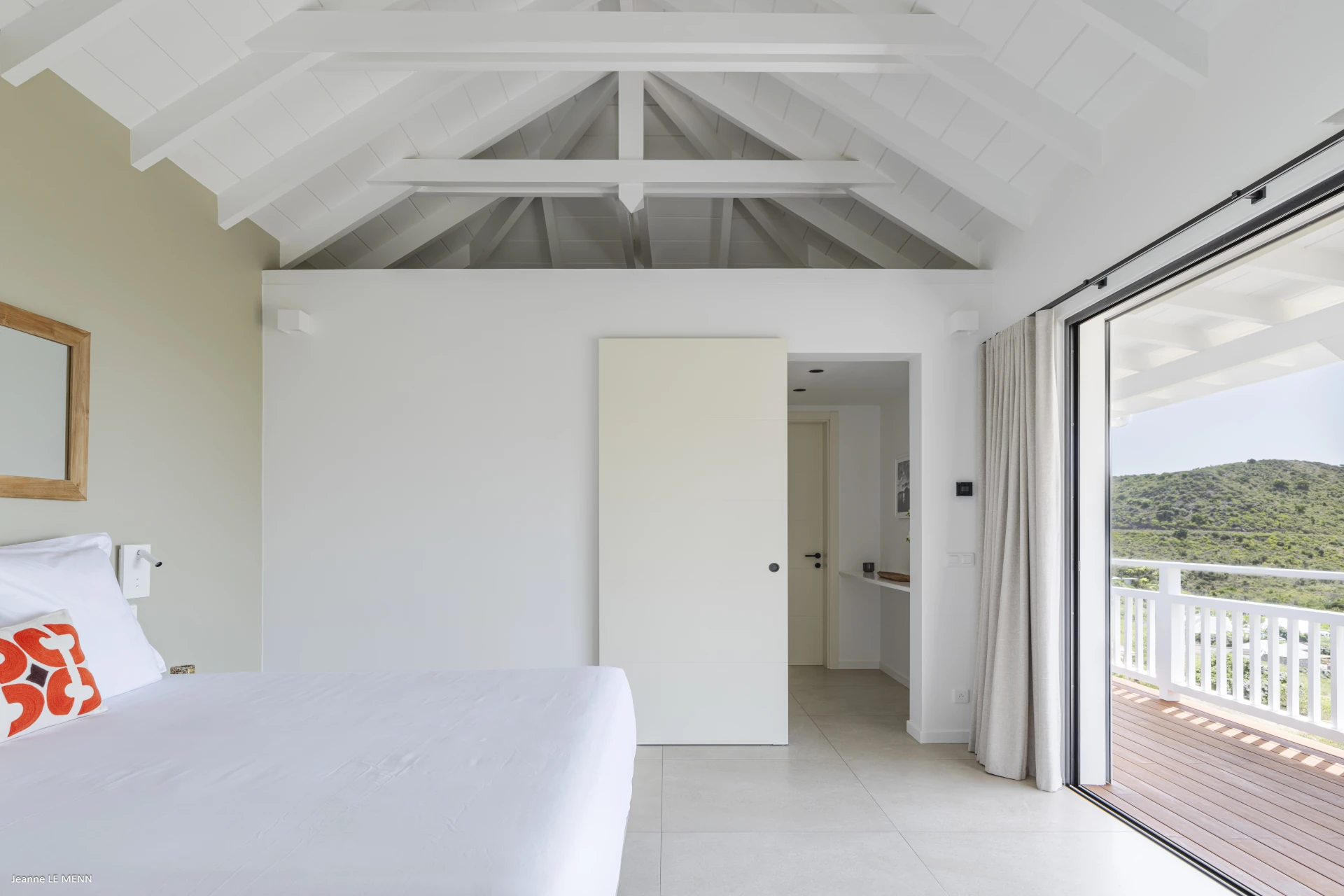 The main terrace, accessible from the living area, hosts a sparkling heated pool surrounded by verdant lawns and shaded loungers, offering mesmerizing views of the bay and St. Barts' natural beauty. A covered section houses an outdoor dining area and cozy seating, perfect for unwinding with a cocktail in the Caribbean breeze. Additionally, a long-covered terrace at the front affords an exceptional panorama of the hillside and the endless expanse of the deep-blue ocean.