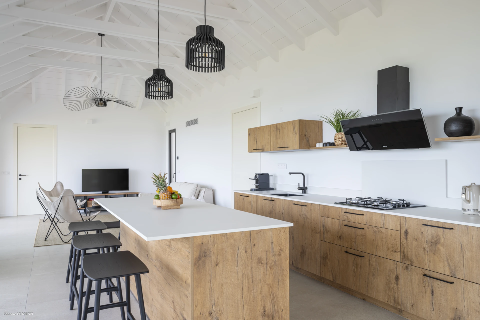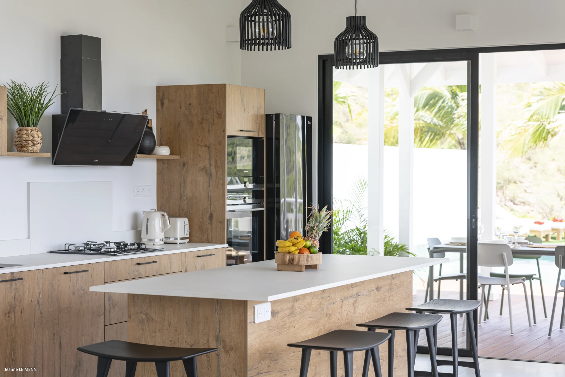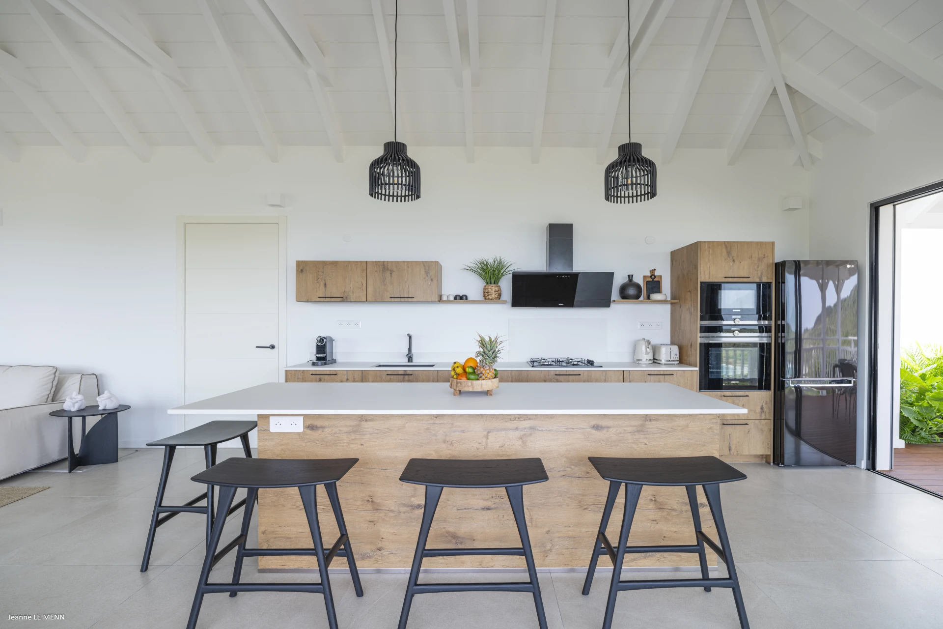 Built on a single level to maximize ocean views, villa Amalur embraces the gentle Caribbean light. Its expansive living space is appointed with plush seating areas for ultimate relaxation. A well-equipped kitchen, complete with a bar and dining area, adjoins the lounge, which features a cozy sofa and armchairs facing the panoramic window framing the ocean view. Large doors open onto the covered balcony at the front and the side terrace, where guests can enjoy al fresco dining beside the pool, enveloped in the serene ambiance beneath the vaulted ceiling.