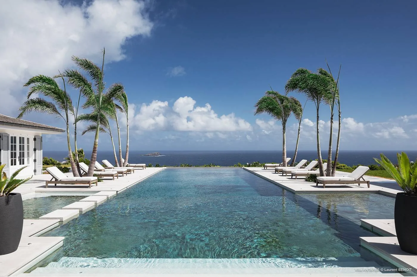 The elongated infinity pool, heated for comfort, creates a stunning illusion of spilling into the sea, flanked by a palm tree-shaded terrace adorned with comfortable chaise lounges – an idyllic spot to savor the mesmerizing vistas.